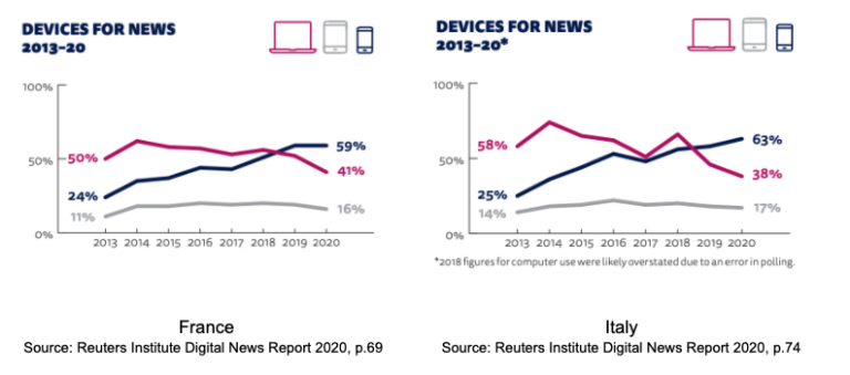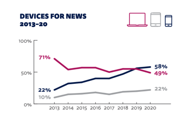 Online patterns have heavily shifted from computers to smartphones. While laptops have long been the main access point for digital news in Germany, smartphones have taken over, with 58% of Germans accessing information via their mobile devices in 2020.