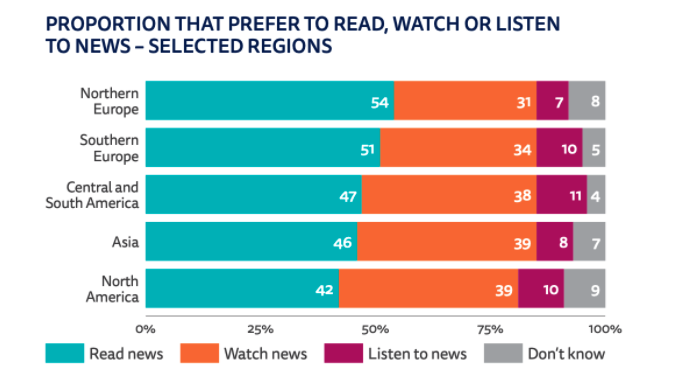 For the majority of Europeans (54% in Northern Europe vs 51% in Southern Europe) reading is the preferred way of consuming news. Still, you can see in the graph below that watching and listening is not far behind (combined 38% in Northern Europe vs 44% in Southern Europe).