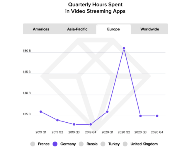 The graph below shows that the time Germans spent in streaming apps peaked during the first Covid-lockdown in 2020. Interestingly, consumers chose the smaller screens on their smartphones over tv, even while at home.