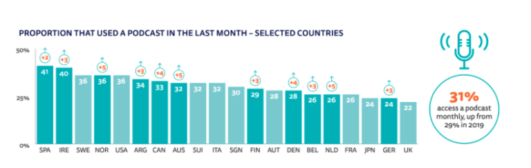 When speaking of multimedia content, we also have to talk about podcasts, which are indisputably a mega-trend. As you can see below, the number of consumers listening to podcasts monthly has continuously increased and now reaches 24% in Germany and even 41% in Spain. The majority of users are younger than 40 years old.